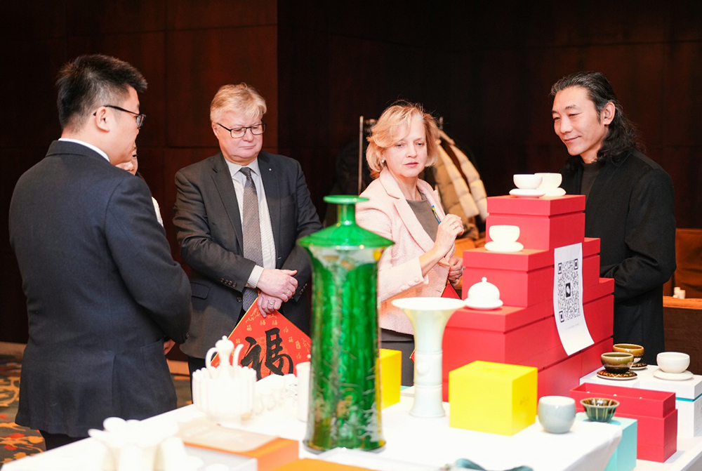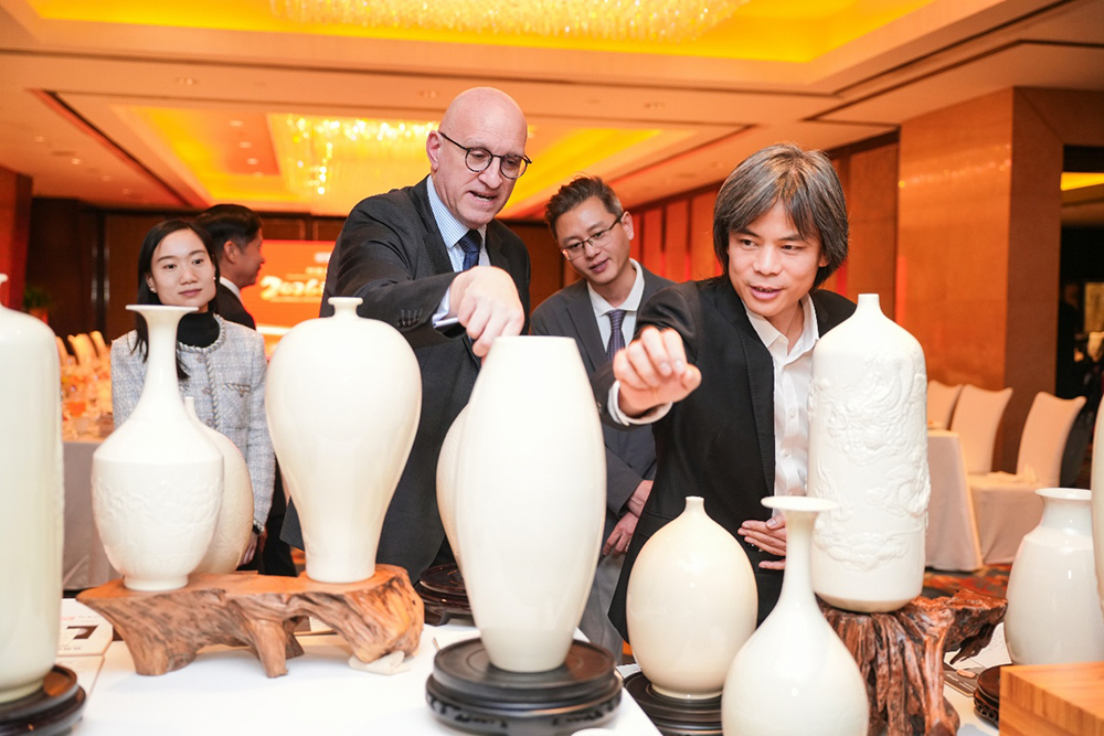 图:河北弘传定瓷文化创意有限公司董事长、弘传定瓷薛兴嶙大师为拉脱维亚驻华大使卡尔利斯·埃亨包姆斯及夫人解读中国定瓷历史文化与制作工艺