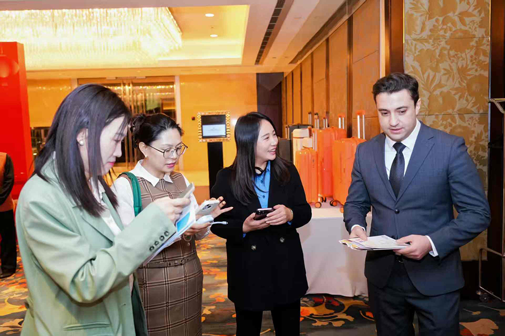 图:企业代表张筱漫为亚美尼亚驻华经济商务参赞卡扎良·科尔伦介绍企业发展与未来规划