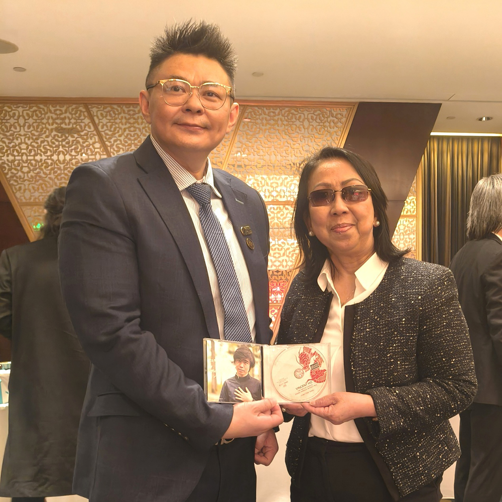 图:东方企业创新发展中心驻马来西亚外交代表李立德赠送国际公共采购联盟-国际文化宣传使者国际著名青年钢琴家杨艺可马年新专辑《十二生肖钢琴曲》给柬埔寨驻华大使宋嘉薇贺马年新春祝福