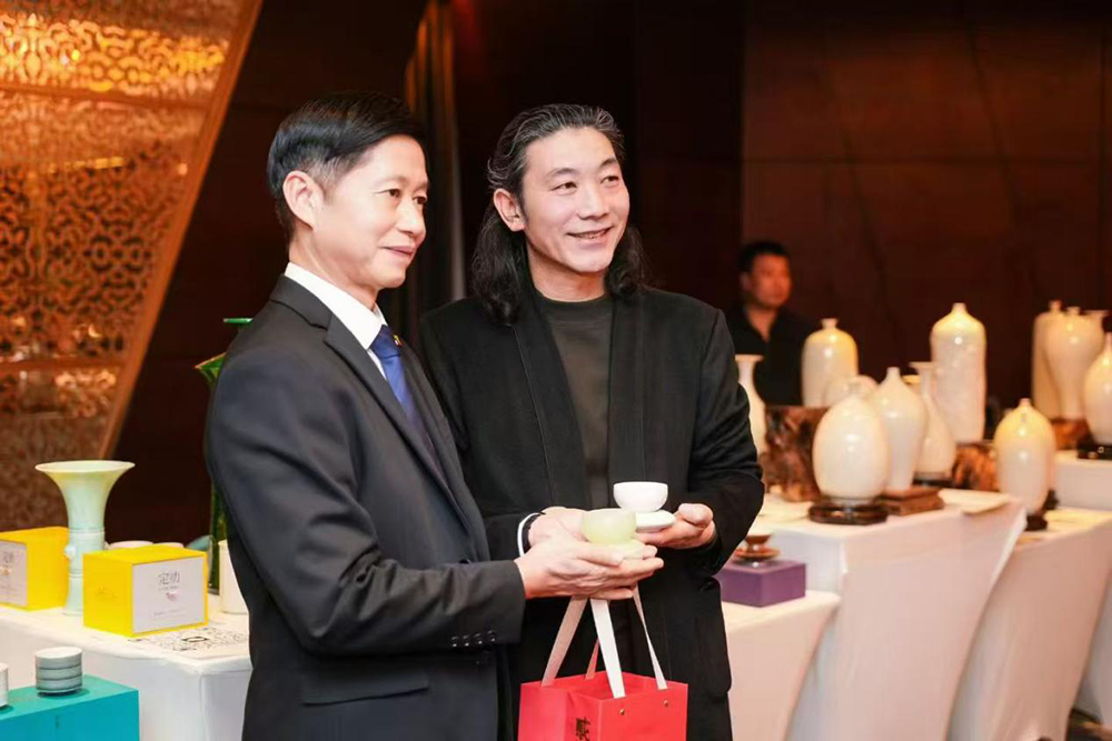 图:河北弘传定瓷文化创意有限公司董事长、弘传定瓷薛兴嶙大师向缅甸驻华大使佐温敏赠送感恩杯贺马年祝福