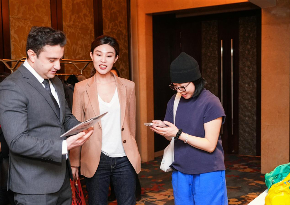 图:企业代表张筱漫为亚美尼亚驻华经济商务参赞卡扎良·科尔伦介绍企业发展与未来规划
