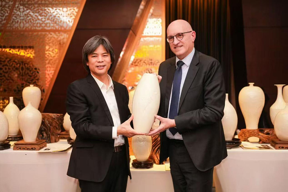 图:河北大宋定窑文化创意有限公司董事长高英坡大师为法国驻华参赞丁永平介绍曲阳定瓷作品制作工艺