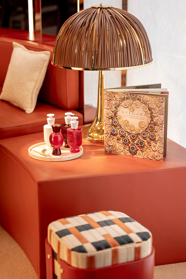 正如所有的宝格丽作品用色彩传递情感、塑造个性印记一样, Salone Olfattivo 香氛概念空间以标志性的温暖自然色调,勾勒出触手可及的奢华质感与惬意氛围。有金色装点的地方,便有馥郁香气陪伴,空间内的香氛作品与金色细节彼此辉映,欢庆珠宝与香氛之间密不可分的灵感联结。