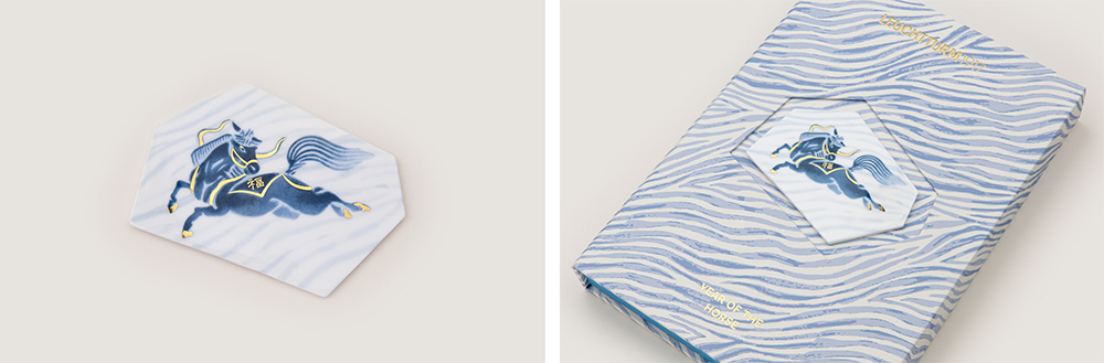 -马年真金鎏彩艺术瓷片:选用高温骨瓷材质,以青花纹饰为基底,采用德国贺利氏(Heraeus)高纯贵金属金水经高温淬炼而成。瓷片釉色温润,纹理细腻,创新磁吸设计,适配多元高端场景。既可嵌入礼盒封面作艺术陈列,亦能吸附于家居提升格调。