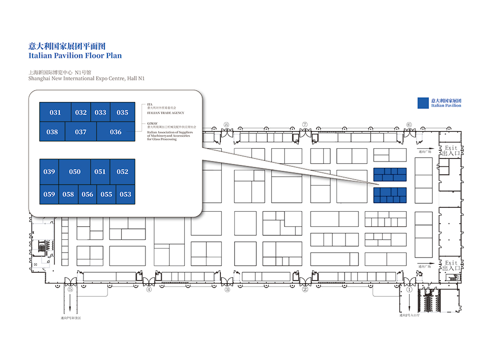 意大利国家展团位于上海新国际博览中心N1馆国际展区,主展位为036号,其余参展企业将主要分布于相邻的031–039及050–059展位区域,形成较为集中的意大利展团展示布局。诚邀来自中国及国际市场的专业观众、合作伙伴和媒体代表莅临意大利馆,了解意大利玻璃加工机械行业的最新技术成果,并就行业发展趋势与合作机遇展开交流。