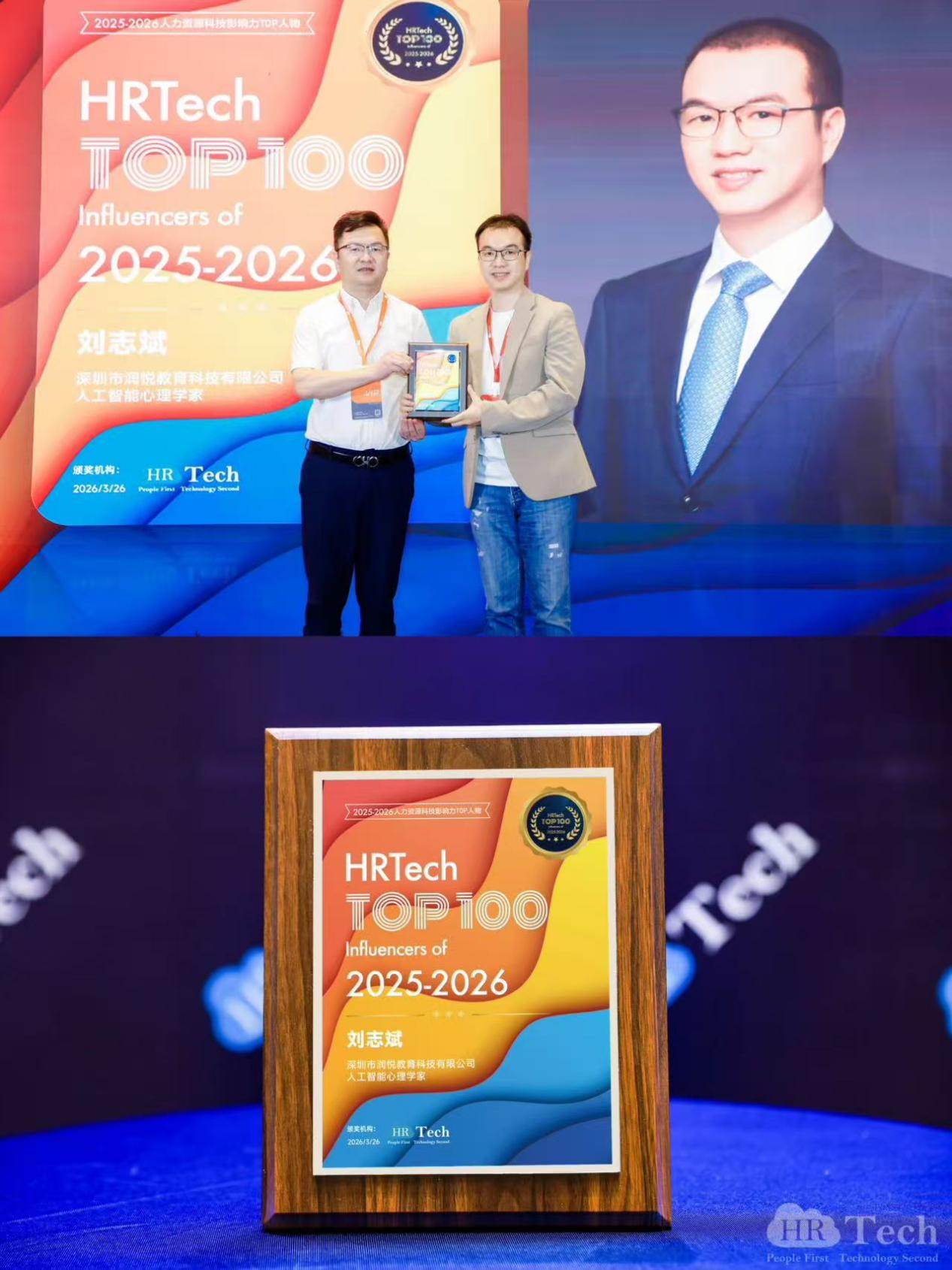 活动现场,“2026 HRTech Awards”颁奖典礼同步举行。凭借在人力资源科技领域的持续深耕与务实探索,志斌老师荣获“2025-2026人力资源科技影响力TOP人物”奖项。