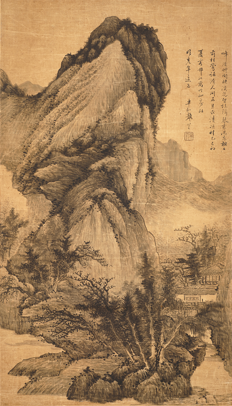 本幅作于康熙二十八年初夏,龚贤时年七十一岁,客居扬州友人处,为临别写赠之作。返回南京后,不久病逝于半亩园。作为龚贤晚年精品,本幅画面凸显深沉之静谧与超然,是其心境与遗民情怀的写照。本幅取法宋人,得李成、范宽山水之势。龚贤的山水画以「积墨法」著称,层层积染、形成浑厚苍茫之风格,有「黑龚」与「白龚」之分。本幅笔墨浓重,浑厚苍润,有撼人之势,为日本藏家钟爱的「黑龚」作品。