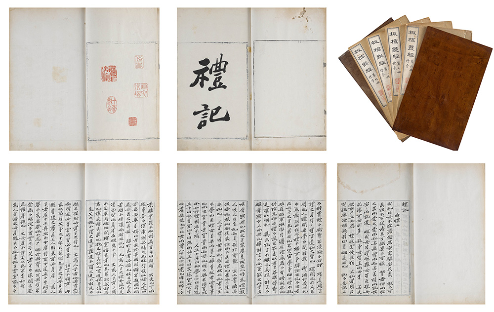 《四书五经》为儒家经典,历代文人视为安身立命之根基。除为科举应试、着文引经之外,更有以背诵默写为乐事,引以为荣者。《郑板桥集》载雍正六年(1728)春,三十六岁的板桥诵读之暇,默写《论语》、《孟子》、《大学》、《中庸》全篇,不足两月即成。经核对原文,无一字之误,后即合装为《四书手读》。此外,两年之前,即雍正四年(1726),三十四岁的郑板桥还默写过《五经》,今藏北京首都博物馆。本四册为郑板桥默写的《礼记》,对照首都博物馆藏《五经手读》,可知本幅写本原与《五经》中其他各经合装一起,也应有十册。尽管没有具体书写年款,或也在郑板桥四十岁之前所书,可知他默写《四书五经》不止一遍。