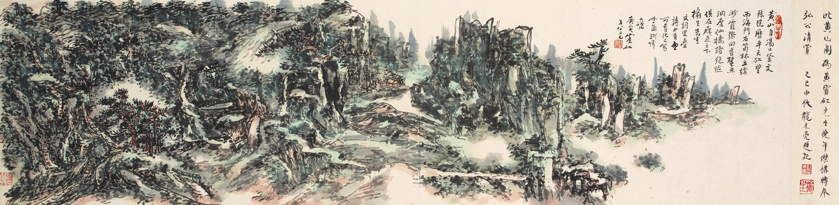 题跋:此〈黄山图〉为黄宾矼先生晚年杰构,转奉弘公清赏。乙巳中秋,龙元亮题记。