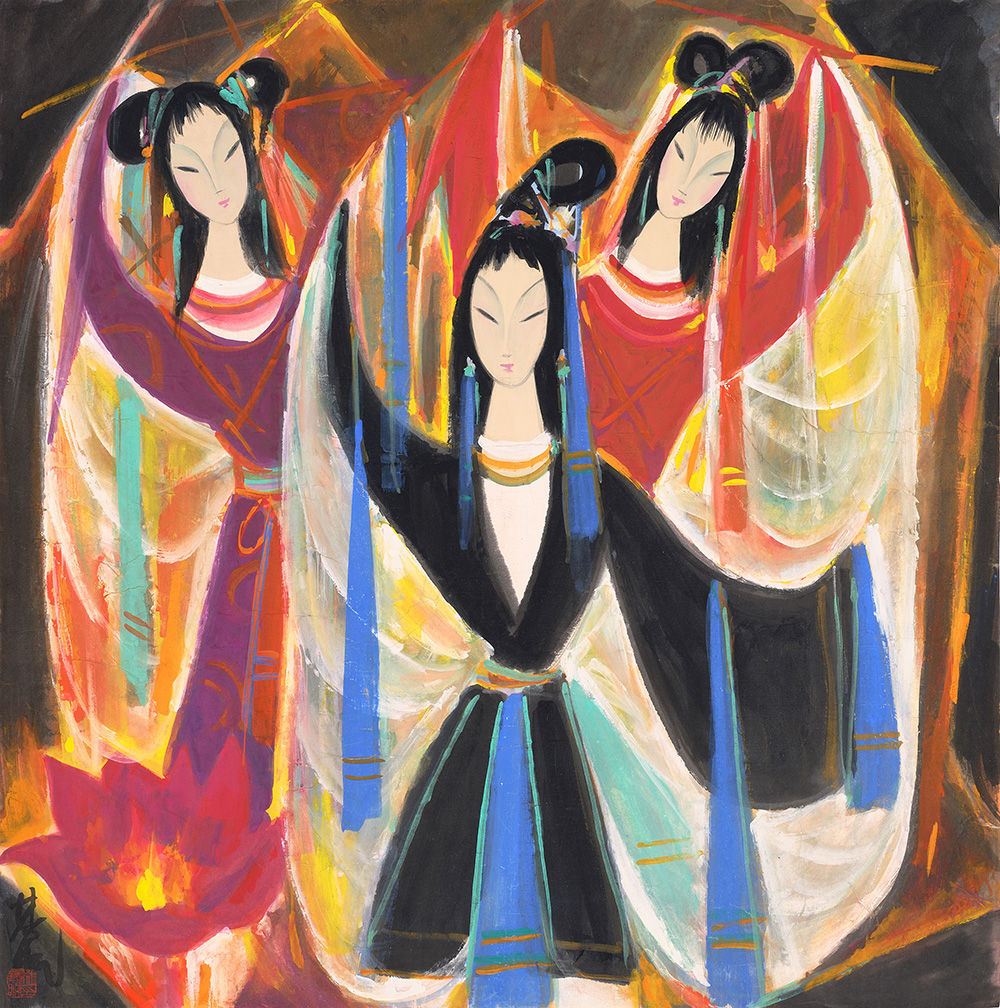 五十年代初,林风眠迷上传统戏剧,谓从分场中领悟到西方立体主义的时空观念,得以在静态的平面上表达时间绵延的连续感,遂渐纳戏剧人物为题材,开创崭新绘画形式 ,「宝莲灯」即其钟爱表现的主题之一。剧中之三圣母颂扬女性在封建桎梏中抗衡命运的积极精神,剧终「劈山救母」、「母子团圆」的经典桥段,也许正是年少失母的林风眠向往的圆满结局。
