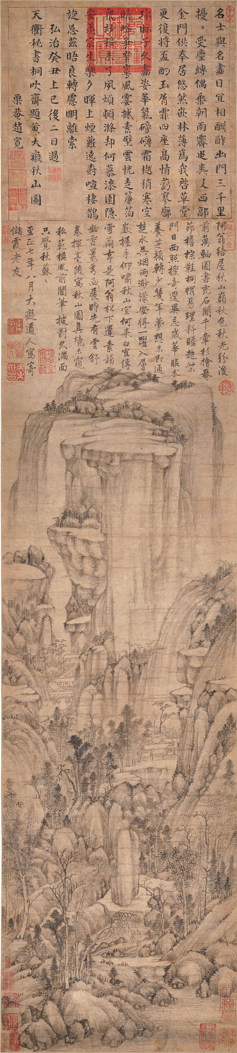 本幅为黄公望《秋山图》之传本,落款至正七年(1347),黄公望时年七十九岁。画写秋山之景,笔墨浑厚,意境深远。画幅上端有明人赵宽于弘治癸丑书写的题跋,画中钤有项元汴和季寓庸的鉴藏印。二十世纪初,本幅流至日本,先为菊池君惺堂收藏,后归细川家族。日本汉学家长尾甲书题跋于木盒,称之「此作追求旧学,笔笔规法北苑,纯主重厚敛雄伟之气。视《富春》、《天池》诸作,似差不类,然其深邃静穆,非人所能及。」本幅曾在日本多次展出,并见载于铃木敬所编《中国绘画总合图录》和入矢义高、何惠鉴编《文人画粹编》等多部出版著录之中,流传有绪。