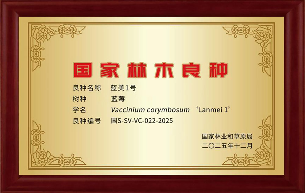 种业是农业的“芯片”。长期以来,国内蓝莓种源高度依赖进口,品种适应性差、成本高、风险大。蓝美股份联合江苏省中国科学院植物研究所、浙江省农业科学院等科研机构,历经多年攻关,成功培育出国家林木良种——“蓝美1号”蓝莓品种。该品种具有高产、易种、花色苷含量高等特点,成活率高达95%以上、亩产2000至5000斤、花色苷含量为普通蓝莓8至10倍等突出优势,被誉为“中国蓝莓产业化栽培的代表性新品种”,一举破解了我国蓝莓种源“卡脖子”问题。目前,公司已建成1700余种种质资源圃,持续开展品种迭代创新。