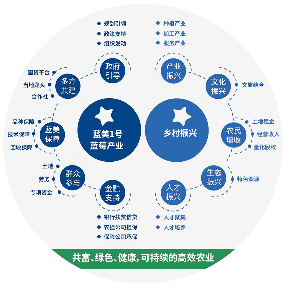 蓝美股份创新探索出“政府引导 + 多方共建 + 农户参与 + 蓝美保障 + 金融支持”的“五位一体”合作模式。在这一模式下,公司协助地方政府制定产业发展规划,推动地方国资企业共同组建合资或全资平台公司,统筹区域蓝莓产业发展。平台公司先行示范种植,带动各类经营主体规模化发展。蓝美股份为经营主体提供优质种苗、全程技术指导与保底收购,保障种植主体实现亩均年产值1.5万元。当地方蓝莓种植面积达到一定规模后,公司投资建设精深加工厂,延伸产业链,提升地方税收与产业韧性。