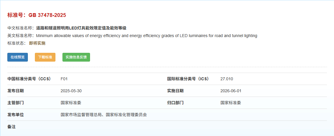 l 5月30日发布的GB37478-2025《道路和隧道照明用LED灯具能效限定值及能效等级》,将于2026年6月1日强制实施,推动企业研发更高能效的LED灯具,在保障照明需求的同时,实现能源的高效利用。