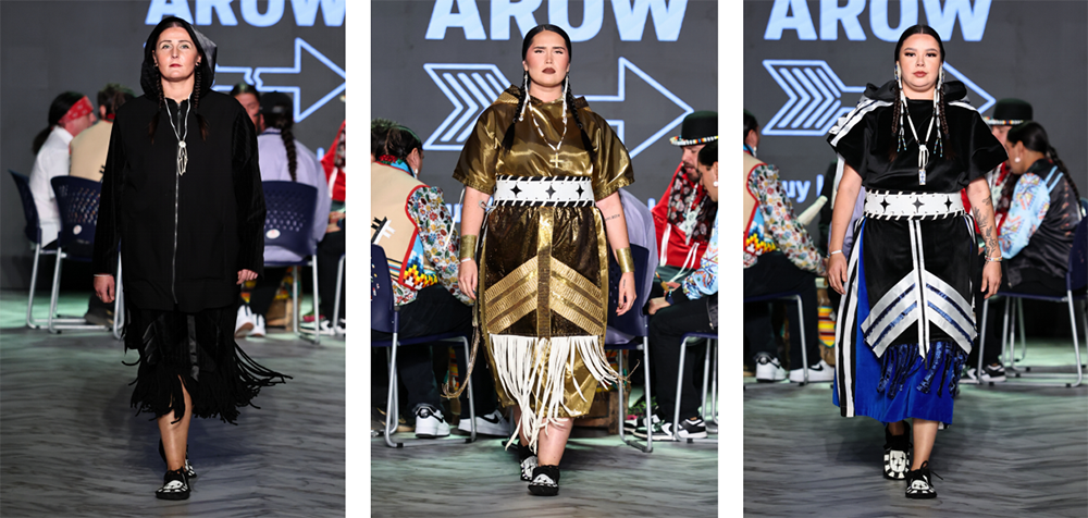 她的首个时装系列 《BROKN AROW》(破箭)源于深刻的个人经历,灵感取自她参与的 太阳舞(Sundance) 仪式及其作为 “六十年代掠夺”(Sixties Scoop) 幸存者的生命记忆。通过缝制织物与视觉艺术的结合,她在秀场上开辟出一个关于真相、疗愈与和解的勇敢表达空间。