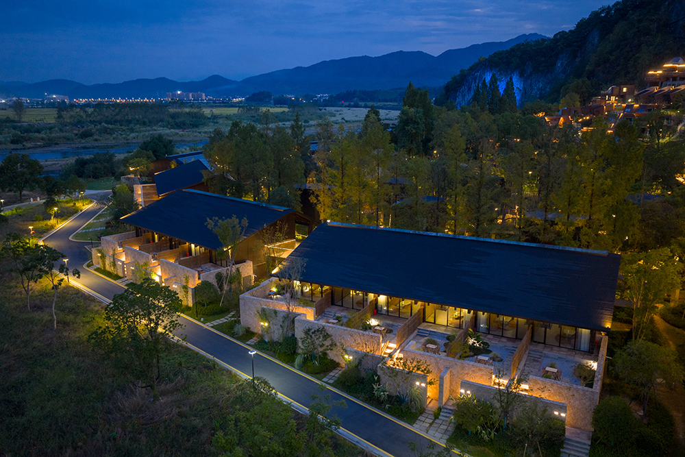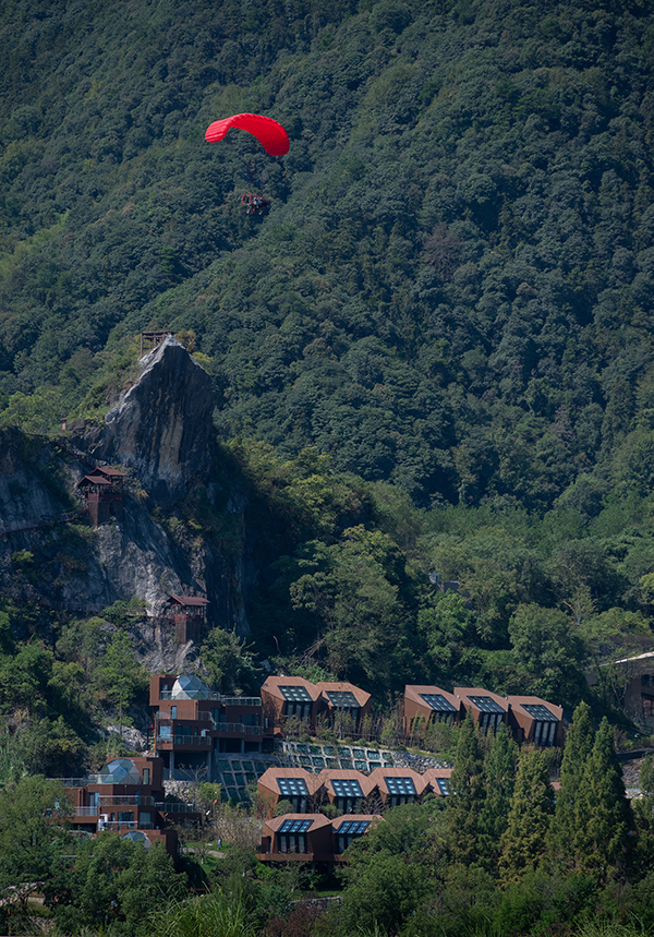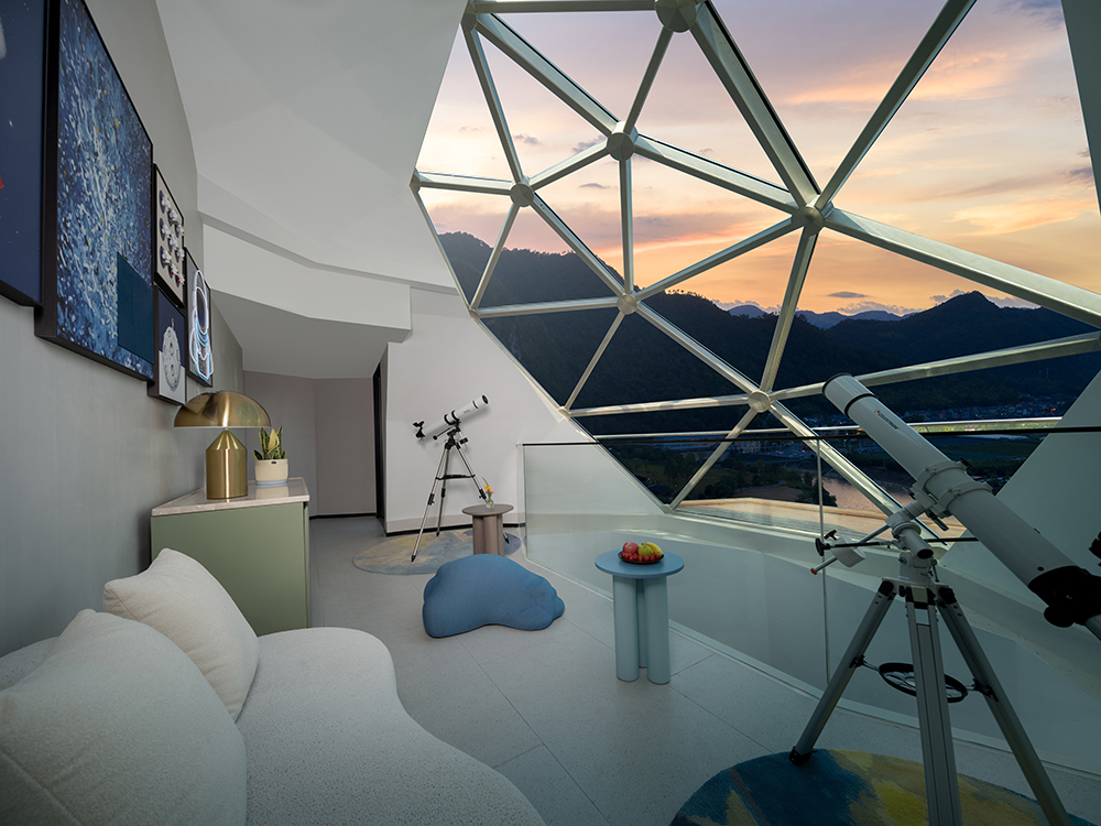 架空设计的海螺屋客房隐于林间,如同童话故事中的精灵居所,为住客营造出私密而梦幻的休憩空间;天文台客房悬于岩壁之上,通过客厅的望远镜和全景天窗可赏星河美景,将浩瀚星空引入室内;炭晶舍客房以传统炭雕艺术为灵感,通体的炭黑色艺术感十足,展现出材料与自然的深度对话;复式结构的玉江舍客房,则让宾客在空间转换中,收获山川、江潮等不同的观景视野,实现移步换景的居住意境。