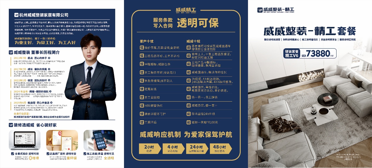 杭州威威整装家居有限公司作为杭州装修行业冉冉升起的新锐力量,以“精工铸造品质,匠心成就美好”为核心理念,专注于为毛坯,老房翻新 ,精装房改造等 、提供全案装修解决方案。尽管是行业新军,但公司核心管理团队与运营骨干均源自杭州本土头部装修企业,他们携带着十年以上的行业沉淀与多个装修实地案例,从工艺标准制定到服务流程优化,均延续了杭城顶尖装修企业的严谨基因,为威威整装注入了专业、可靠的品牌底色。