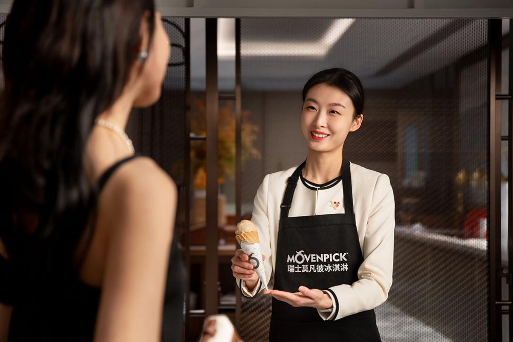 而品牌标志性的24小时冰淇淋热线,更是将甜蜜便捷拉满——无需出门,只需一通电话,定制款的瑞士「国宝级」Mövenpick冰淇淋便可即刻送达客房。