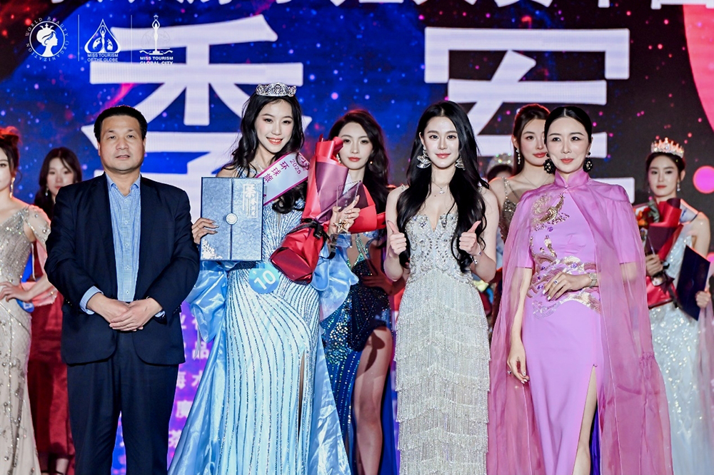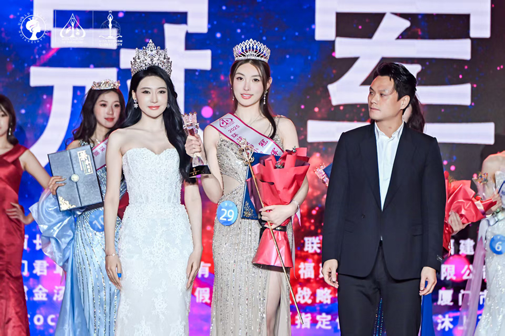 图:2025环球国际小姐中国总冠军朱琳(右一)为获得亚军的候君宜颁奖