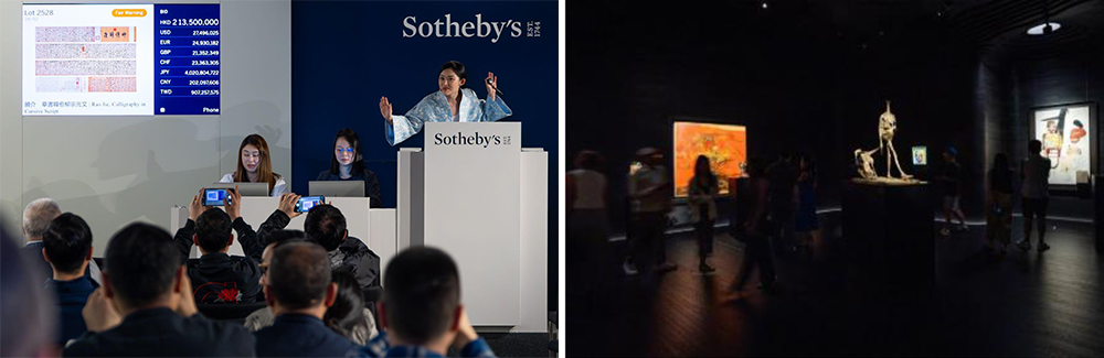 (左至右)饶介《草书韩愈柳宗元文》在中国古代书画的拍卖现场;苏富比旗舰艺廊举办了近80场博物馆级展览及拍卖会,自开幕以来吸引逾百万名访客莅临参观