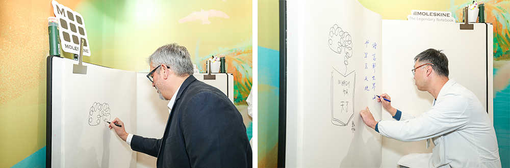 《嘿,一起走——与照护同行》自开放以来,获得大量公众关注。MOLESKINE在展览中设置了一本巨型笔记本,供观众驻足、阅读与记录。23日的现场共创仪式成为一场“让书写真实发生”的互动。参展代表与嘉宾在没有预设主题的情况下,在MOLESKINE巨型笔记本上留下所感所想,让此次联名的内涵继续生长。书写,在现场自然发生;灵感,在空间中生根发芽。