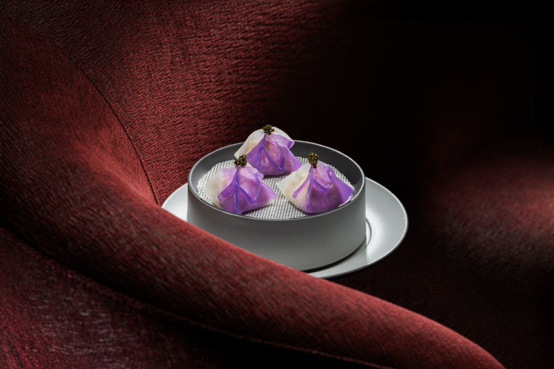 点心精选手拆蟹肉与鲜嫩虾仁,佐以清脆芦笋粒和天然蝶豆花汁,交织出丰富多元的口感层次,在味觉与视觉上均呈现出精致的艺术美感。