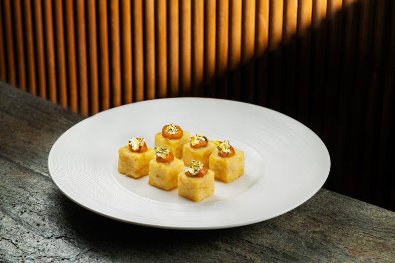将上汤、海胆与鸡蛋完美融合,冷凝定形后,再裹上轻薄脆浆酥炸。繁复工序铸就外层酥脆轻薄、内里冰凉柔滑的惊艳质感,尽显粤菜点心对技艺与层次的不懈追求。