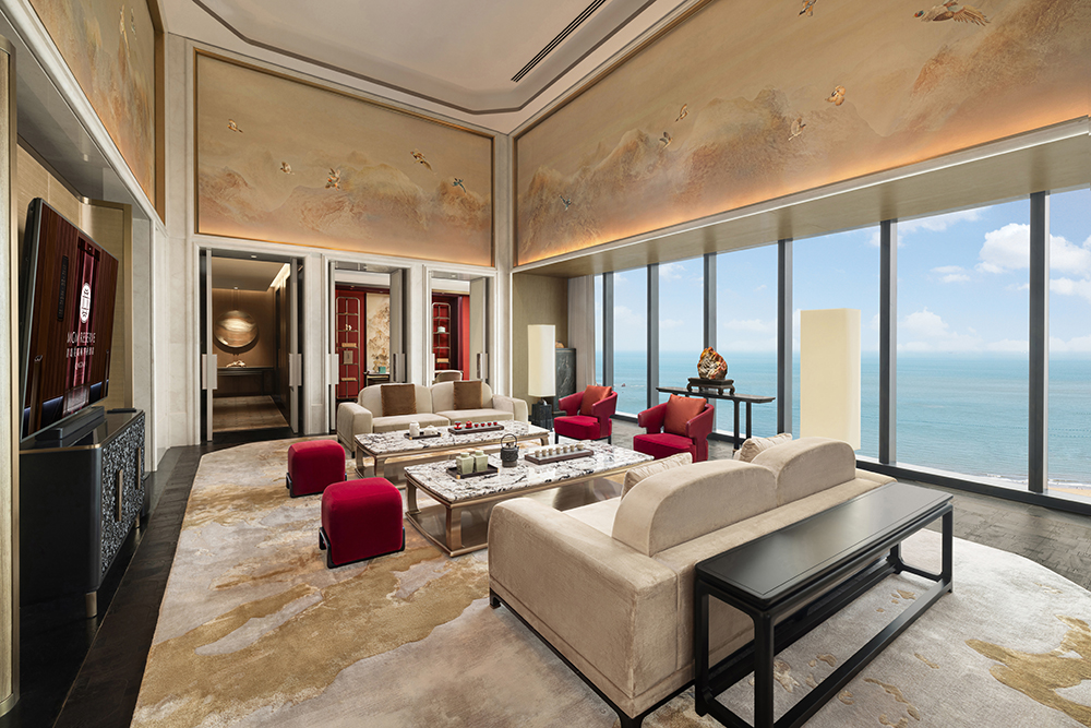 酒店共设116间客房,每一间都承载着“府邸”的居住美学。客房分别以“海洋蓝”“夕阳金”“中国红”为主题色调,融合中国宅院的秩序感与青岛山海的自然韵律,构筑出既在地又当代的生活空间。美高梅华府总统套房更藏叙事巧思,以崂山风景为核心脉络,将晨曦微熹、日出霞光、星夜静谧等不同时辰的景致色彩,层层铺陈于卧室、客厅、餐厅等空间,和谐相融,渐次递进。入住其间,仿若栖身崂山胜景之中,亲历山间时光流转的静谧与灵动。